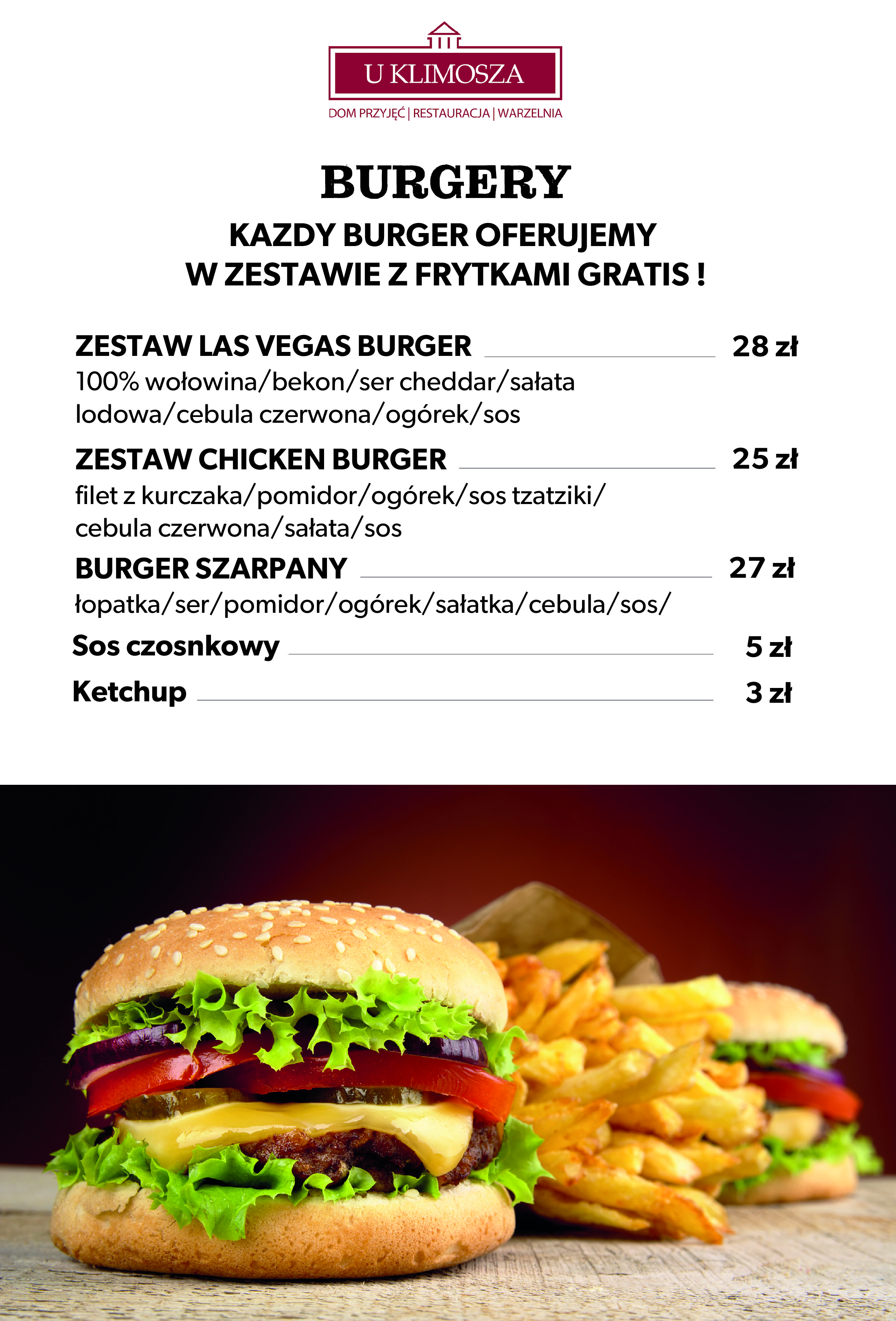 Każdy burger oferujemy w frytkami GRATIS! Oferujemy burgery z 100% wołowiny, z kurczakiem lub z szarpaną karkówką.