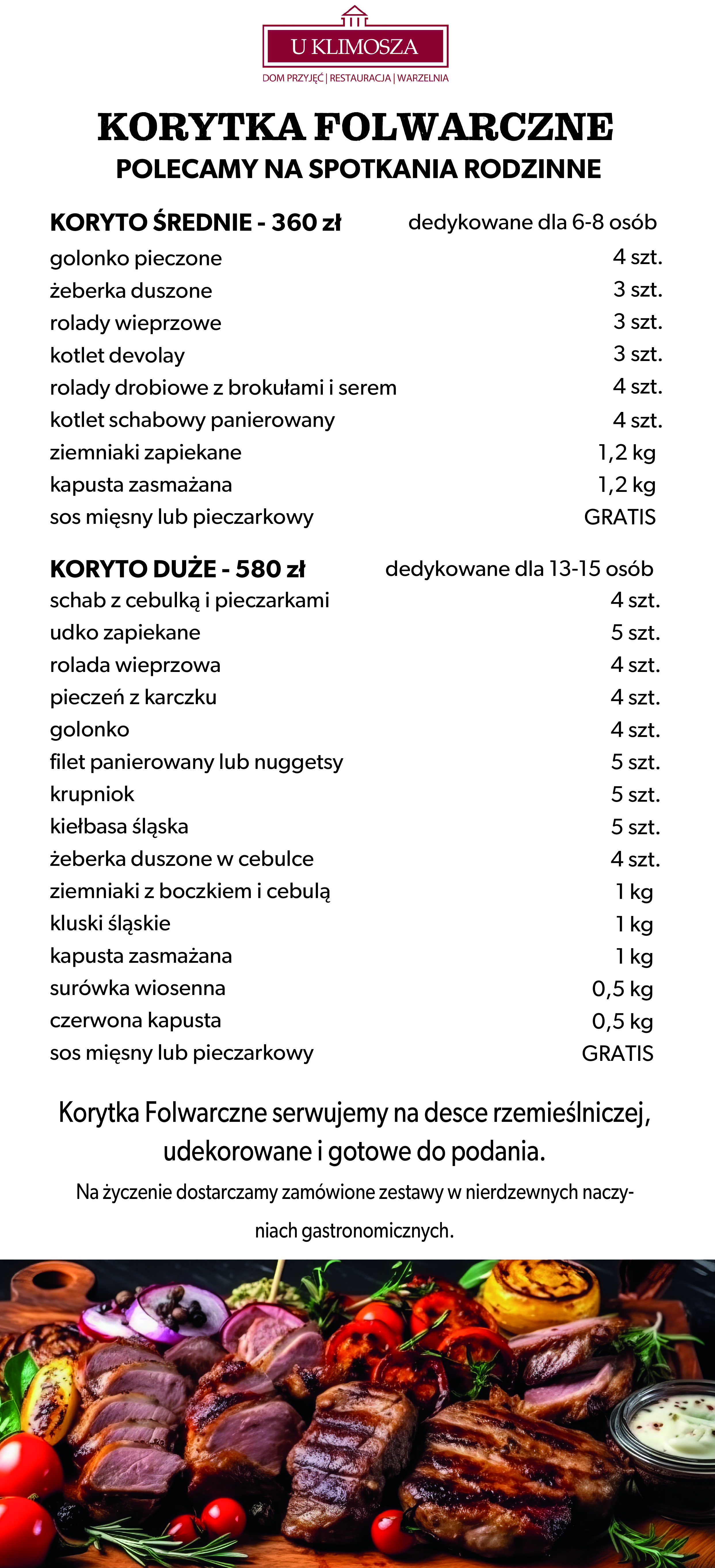 Spotkanie rodzinne? Wizyta przyjaciół? Impreza okolicznościowa w domu? Koryta to idealna propozycja - smaczne, swojskie, pięknie podane - każdy będzie pojedzony do syta! Koryta oferujemy w trzech wariantach w zalezności od ilości gości. Więcej informacji w ulotce poniżej.